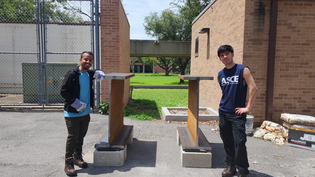 Two beams are positioned outside the Department of Civil Engineering Department at the University of Texas Rio Grande Valley as part of a research project to evaluate thermal response for steel I-girder bridges. This experimental effort aims to measure vertical thermal gradient on exterior (exposed) girders due to uneven heating from solar radiation, which can induce significant bridge responses.